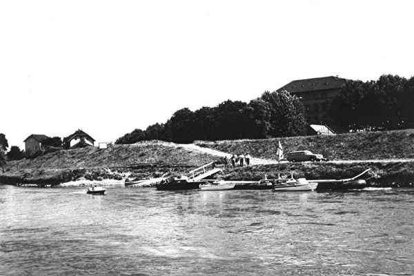 Unser erstes Clubhaus kam 1968 ganz unerwartet und als Ganzes zu uns. Nach dem Neubau der Europabrücke über den Rhein von Kehl nach Straßburg wurde das ADAC-Grenzhäuschen nicht mehr gebraucht. Mit Hilfe französischer und deutscher Pioniere wurde es auf das Gelände des Nautic Club transportiert und zwischen unserer Bootshalle und der Tankstelle positioniert. Unser Clubleben hatte damit einen neuen Mittelpunkt gefunden. Der Transport des ADAC-Grenzhäuschens war eine aufregende Sache. Die Bilder sprechen für sich: