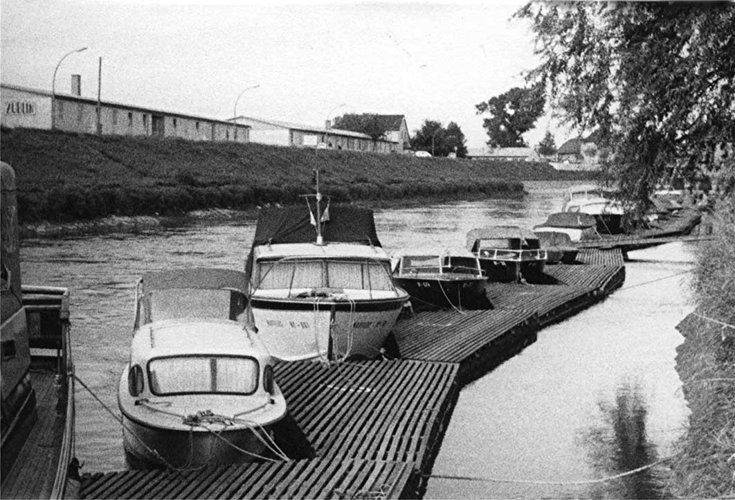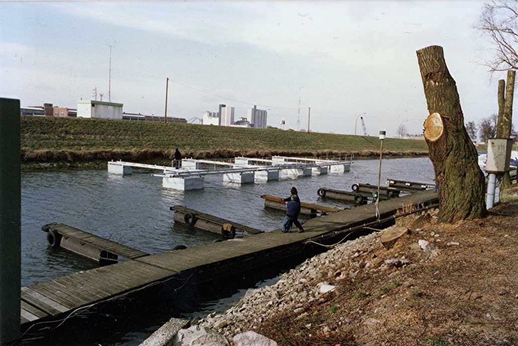 Unsere Stege haben sich im laufe der Zeit gewandelt. Waren die ersten noch Gummipontons, denen häufig die Luft aus ging, hatten die zweiten schon Flugzeugtanks als Schwimmer. Zu festen Holzstegen kamen wir mit Hilfe französischer Pioniere und im Jahre 1989 begannen wir mit dem Austausch der Holzstege durch Metallstege. Sie bekamen auch Trinkwasser- und Stromanschluss und eine Beleuchtung. Das geschah allerdings in einzelnen Etappen, die jeweils mit einer Stegeinweihung gefeiert wurde. Die letzte Holzbeplankung wurde 2007 durch Stahlgitter ersetzt.